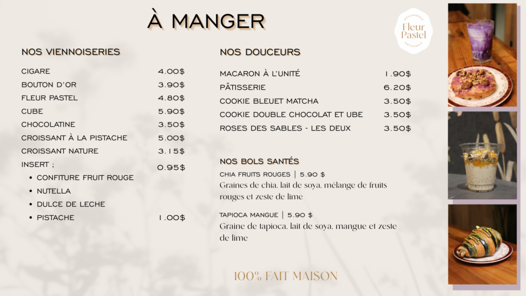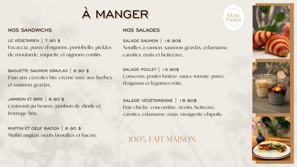 Chaque jour, le café Fleur Pastel vous propose de délicieux mets, boissons, collations et gourmandises prêts à satisfaire vos papilles exigeantes !